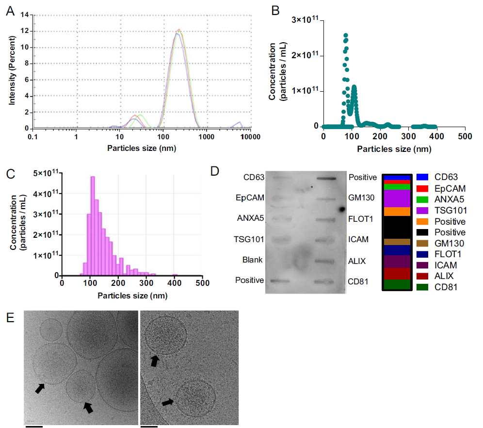 A. 通过动态光散射(DLS)技术确定的PEVs大小分布图, 其中主峰大约在200纳米左右。B. 通过可调电阻脉冲传感(TRPS)技术确定的PEVs数量和大小分布图。C. 通过纳米粒子跟踪分析(NTA)技术确定的PEVs数量和大小分布图。D. 人类特异性抗体阵列与PEVs孵育后的图像,评估EVs标记物TSG101、ALIX、CD81、FLOT1、CD63和ANXA5的表达。E. 代表性的冷冻电子显微镜(Cryo-EM)图像显示PEVs的脂质双层膜,箭头指示了脂质双层的存在。尺度条表示100纳米。