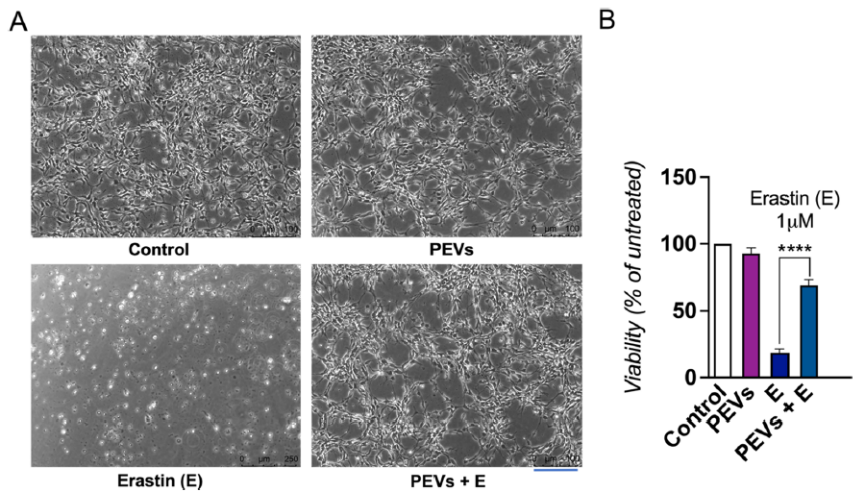 A. LUHMES细胞经PEVs处理后,随后添加1 μM神经毒素erastin。图像显示了24小时后的细胞形态,比较了erastin处理和PEVs处理的细胞形态差异。B. 通过CCK-8实验量化了LUHMES细胞在24小时后的活性,展示了erastin和PEVs处理对细胞活性的影响。