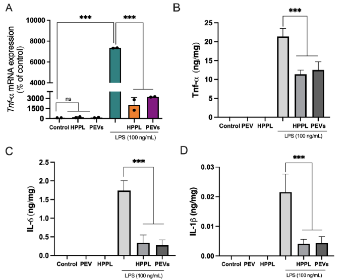 A. LPS被用来诱导BV-2细胞的激活,1小时后添加PEVs和HPPL(用作非炎症对照)处理后的TNF-α基因表达水平。B-D. 通过ELISA定量细胞上清液中TNF-α、IL-6和IL-1β的蛋白表达水平。