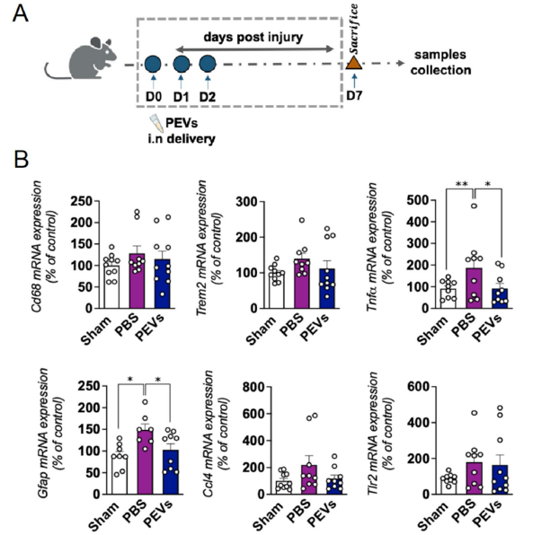 图4 A. 示意图说明了CCI-TBI小鼠模型用于评估PEVs治疗的抗炎效果,包括CCI手术和PEVs的给药方案。给药途径:鼻内注射(i.n.)。PEVs剂量:每次60 μL(含1.2×10^8颗粒),连续给药3天,总剂量180 μL。对照组:给予等体积PBS。B. 展示了PEVs处理对受伤后炎症标记物表达的影响,包括Gfap、Cd68、Trem2、Ccl4、Tlr2和Tnf-α基因的表达变化。