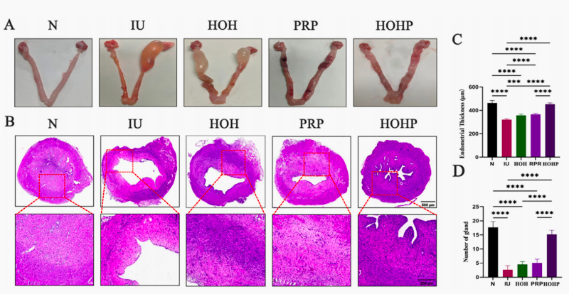 图1. HOHP对恢复子宫内膜厚度及腺体数量的体内效应。A. 术后第21天大鼠离体子宫不同处理组代表性图像;B. 大鼠子宫组织结构H&E染色图像;C. 各组子宫内膜厚度定量分析;D. 各组腺体数量定量分析。
