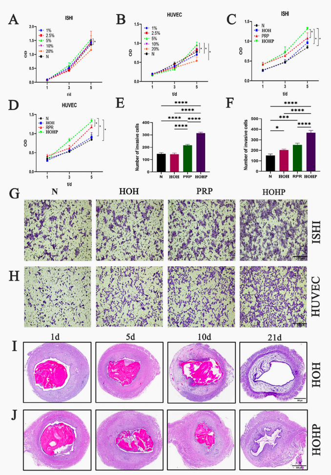 图2.水凝胶的体外细胞相容性与体内降解性能。A-B. 不同浓度PRP对石川细胞和人脐静脉内皮细胞(Ishikawa和HUVECs)增殖的影响;C-D.通过CCK-8检测试剂盒分别在培养第1天、第3天和第5天检测与水分子、PRP及HOHP条件培养基共培养的Ishikawa和HUVECs的增殖情况;E-H. 细胞迁移染色及其定量分析;I-J.水凝胶体内降解实验。各组均进行三次独立实验,数据以均值±标准差表示,p值采用单因素方差分析计算。*p < 0.05, ***p < 0.001, ****p < 0.0001.