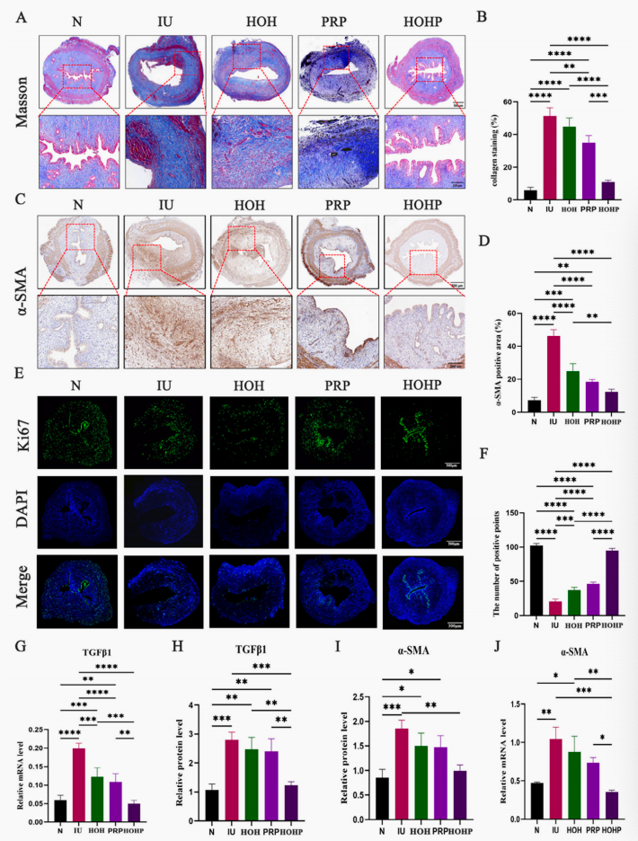 图3. HOHP对子宫内膜胶原沉积的体内效应。A. 采用马松染色法评估子宫内膜纤维化情况:染色组织切片中观察到的蓝色区域表示瘢痕形成;B. 纤维化面积比值的定量分析;C-D代表性免疫组化染色图像及α-平滑肌肌动蛋白(作为纤维化标志物)的定量分析;E-F. 免疫荧光染色及Ki67(细胞增殖标志物)的定量分析;G. TGFβ1蛋白质印迹法的统计学结果;H. 以GAPDH为内参的TGFβ1 mRNA表达量;I. α-平滑肌肌动蛋白蛋白质印迹法统计结果;J. 以GAPDH为内参的α-平滑肌肌动蛋白mRNA表达量。