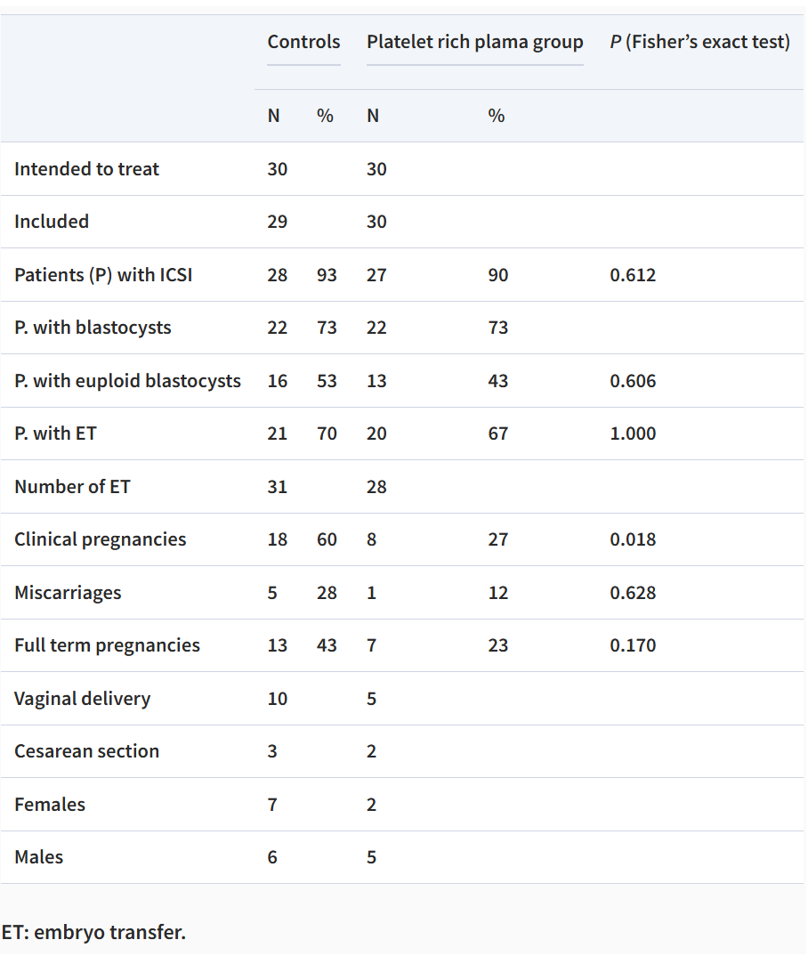 Barrenetxea, G., Celis, R., Barrenetxea, J., Martinez, E., De Las Heras, M., Gómez, O., & Aguirre, O. (2024). Intraovarian platelet-rich plasma injection and IVF outcomes in patients with poor ovarian response: a double-blind randomized controlled trial. Human Reproduction, 39(4), 760–769.doi: 10.1093/humrep/deae038.