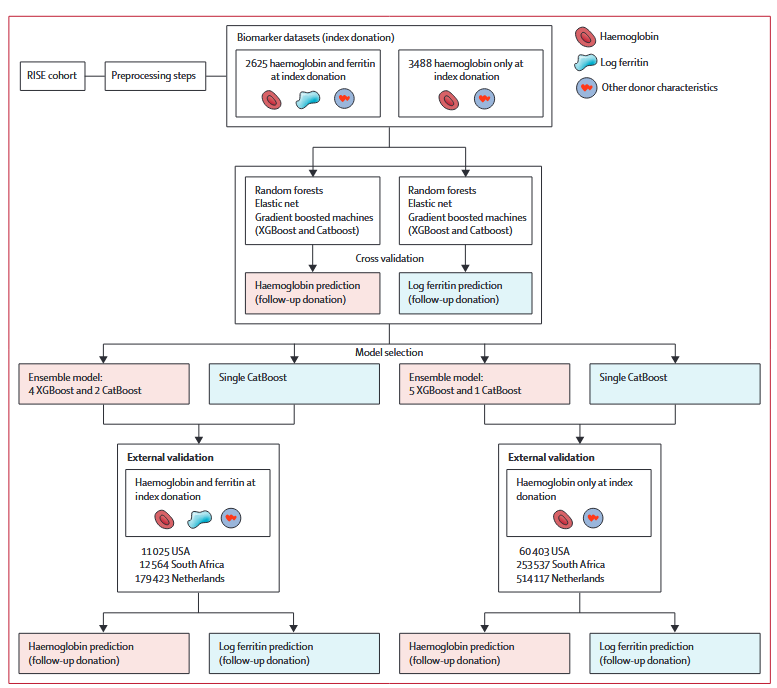 重复献血可导致或加重铁缺乏症,但个体风险存在差异。缺铁可引起疲劳、嗜睡、认知功能下降和不宁腿综合征等症状。一般采用检测献血前指尖血红蛋白来确保献血者达到最低献血要求阈值。然而,血红蛋白却不是反应铁储存的可靠标志物,不能识别许多低铁和缺铁献血者;而铁蛋白作为铁储存的标志物,识别缺铁献血者更加准确。但由于缺乏即时检测,无法进行献血前筛查,低铁蛋白献血者通常在献血后才能被告知他们的状态,并推迟延长献血期。因此,直接预测血红蛋白和铁蛋白机械学习模型有助于优化重复献血之间的间隔、管理与献血相关的缺铁并避免低效的血红蛋白延迟献血。此类机器学习模型尚未开发,也尚未在国际上得到外部验证,外部验证对于评估普遍性、为模型部署提供信息和防止可能导致不良后果的误差临床预测至关重要。因此,本研究旨在开发和外部验证预测献血者的血红蛋白和铁蛋白机器学习模型,以便定制献血者重复献血的最短间隔。