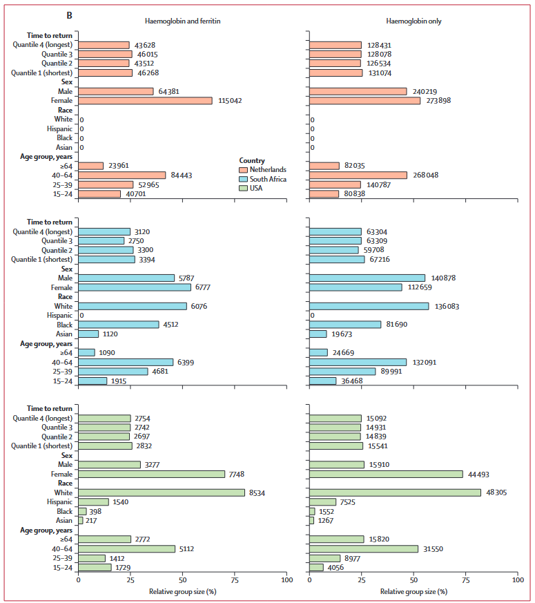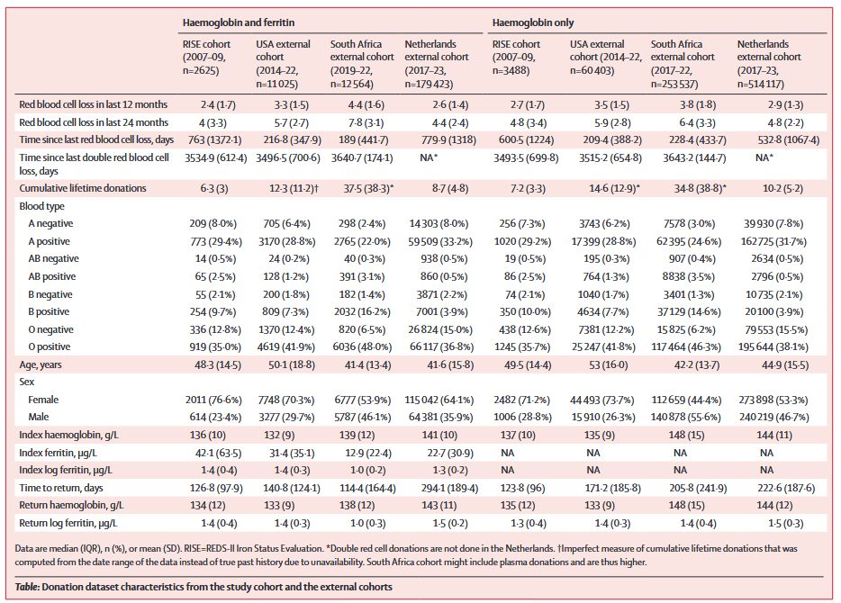 LiW, SuCY, MeulenbeldA, JagirdarH, JanssenMP, Swanevelder R, BruhnR, Kaidarova Z, BravoMD, CaoS, CusterB,vandenBergK, RussellWA.Machine-learning models to predict iron recovery after blood donation: a model development and external validation study. Lancet Haematol. 2025 Jun; 12(6):e431-e441. doi:10.1016/S2352-3026(25)00068-7. PMID:40447352.