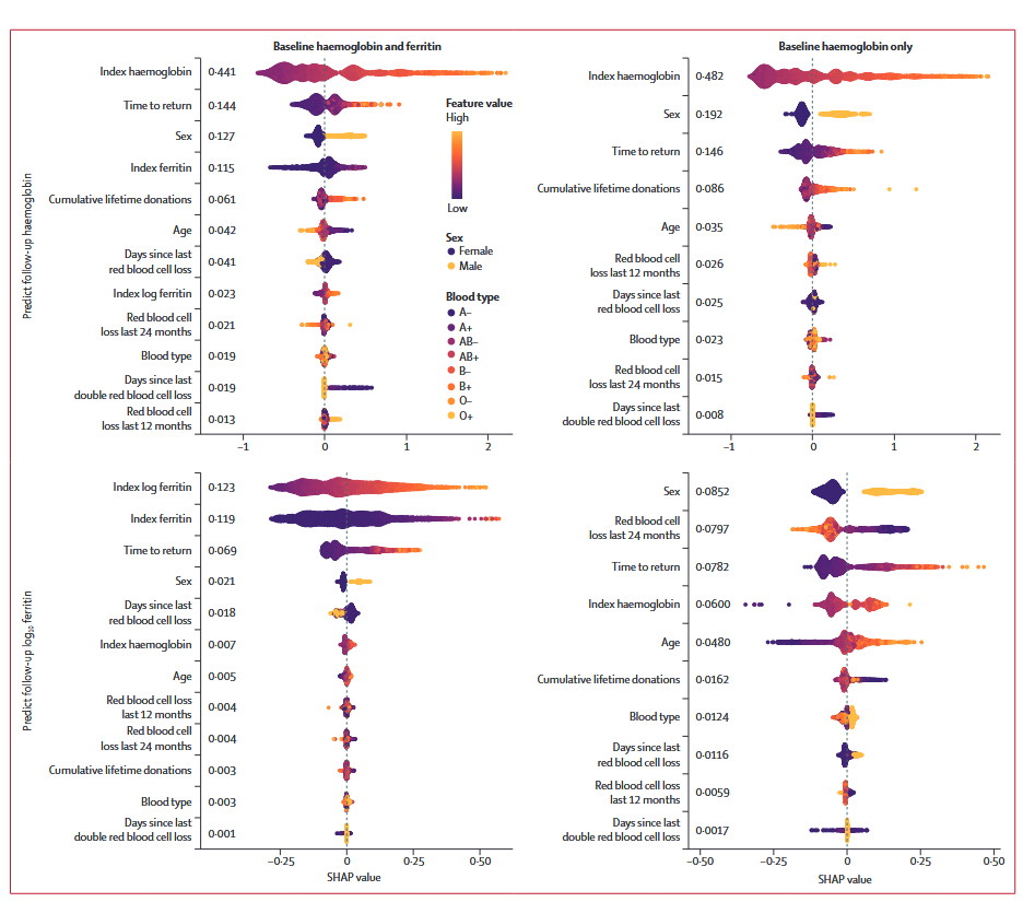 2.在预测再次献血血红蛋白时,对预测的总体贡献最大的特征(Shapley additive explanations,SHAP)是首次献血时的血红蛋白,其次是再次献血的时间间隔和性别。在预测再次献血时献血员的铁蛋白含量时,首次献血时的log10铁蛋白和铁蛋白的贡献最大,其次是再次献血时间。当缺乏首次献血时的铁蛋白,预测再次献血铁蛋白时,性别贡献最大。
