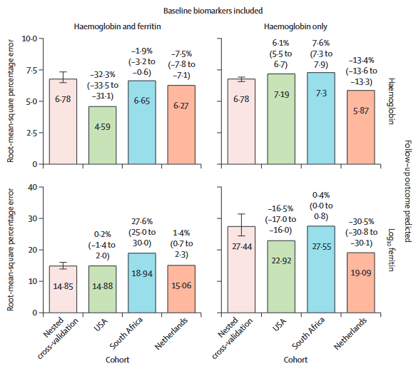 3.在外部验证中,RMSPE在仅含血红蛋白数据集以及血红蛋白和铁蛋白数据集中分别增加不超过0.4%和28%。在预测再次献血时献血员的血红蛋白含量时,血红蛋白和铁蛋白数据集中的外部验证RMSPE均低于RISE中的嵌套交叉验证RMSPE:美国为4.6(-32%),南非为6.7(-2%),荷兰为6.3(-8%,图3)。在仅含血红蛋白数据集中,RMSPE在美国为7.2(+6%),在南非为7.3(+8%),在荷兰为5.9(-13%)。在预测再次献血时献血员的铁蛋白含量时,血红蛋白和铁蛋白数据集中的RMSPE在美国为14.9(+0.2%),南非为18.9(+28%),荷兰为15.1(+1%)。在仅含血红蛋白数据集中,美国的RMSPE为22.9(-17%),南非为27.6(+0.4%),荷兰为19.1(-31%)。