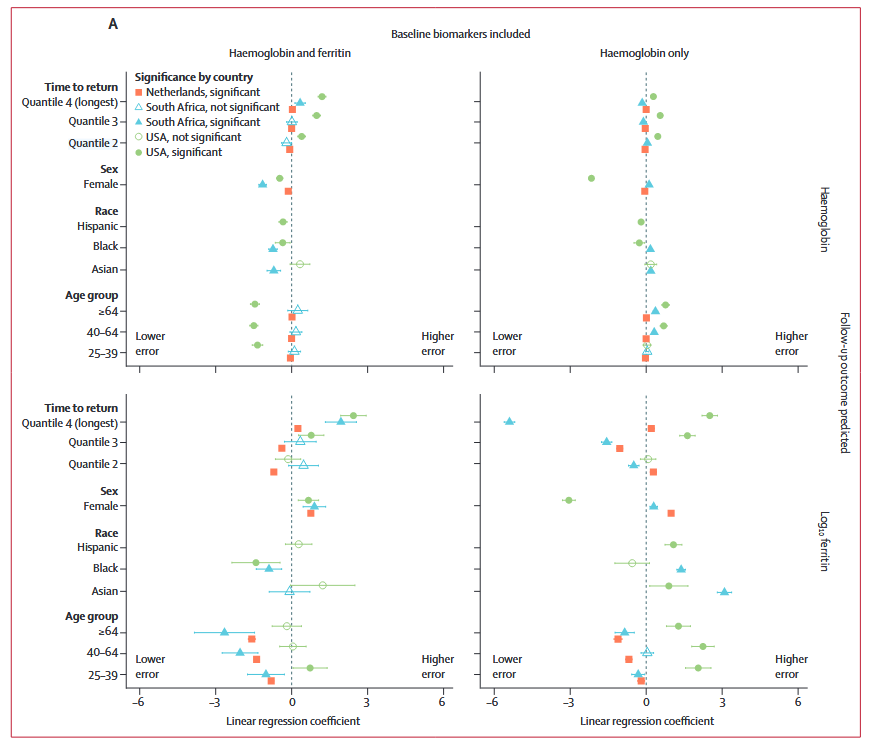 6. ① 在含血红蛋白和铁蛋白数据集中,再次献血的间隔时间越长,预测误差越高。除此之外,在美国和南非,西班牙裔和黑人捐献者与白人捐献者相比具有相似或更低的误差。而女性献血者的铁蛋白误差较高,血红蛋白误差较低。与15-24岁的年轻群体相比,在南非和荷兰,年龄较大的捐献者铁蛋白误差往往较低,在美国对血红蛋白的误差往往较低。② 在仅含血红蛋白数据集中,再次献血的间隔时间和性别对铁蛋白预测的影响因国家或地区而异。再次献血之前的间隔时间长可减少南非的误差,但却增加了美国和荷兰的误差。在美国,女性捐献者的误差较低,但在南非和荷兰队列中,女性捐献者的误差略高。
