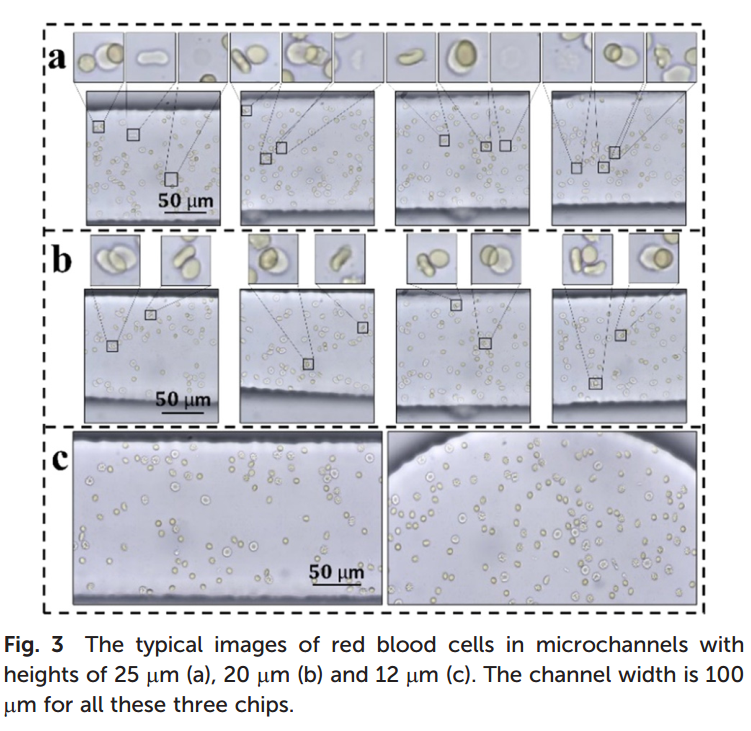 图1红细胞在高度分别为25 μm(a)、20 μm(B)和12 μm(c)的微通道中的典型图像。三种芯片的通道宽度均为100 μm