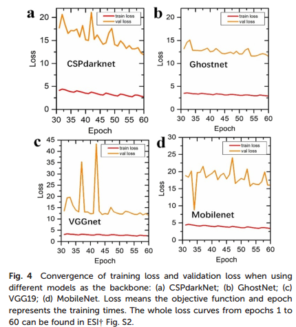 图2 不同骨干网络模型下训练损失和验证损失的收敛情况:(a)CSPdarkNet;(B)GhostNet;(c)VGG 19;(d)MobileNet。Loss表示目标函数,epoch表示训练时间。