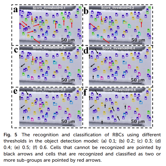 3.红细胞识别实验显示,当目标检测模型阈值(score_threshold)较低(0.1–0.2)时,所有红细胞均被识别,但同一细胞可能被错误分类到多个亚组(红色箭头,图3a、3b);阈值为0.3时,图像出现少量未识别红细胞(黑色箭头),多亚组分类情况明显减少(图5c);阈值提高至0.4–0.5时,绝大多数红细胞可正确归入单一亚组(图5d、5e),但阈值过高(0.6)会导致部分细胞未被识别(图5f)。结果表明,红细胞亚组多且特征差异细微,仅通过调整阈值难以同时实现完整识别与准确分类,提示需优化识别策略以确保血液质量评估的精确性。