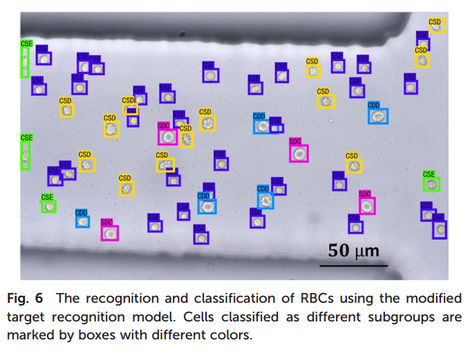 图4 利用改进的目标识别模型对红细胞进行识别和分类。不同亚群的细胞用不同颜色的方框标记