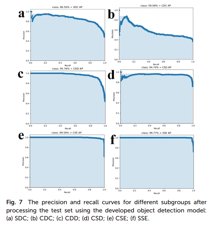 图5 使用开发的对象检测模型处理测试集后不同亚组的精确度和召回率曲线:(a)光滑盘状细胞(SDC);(B)皱缩盘状细胞(CDC);(c)皱缩圆盘状细胞(CDD);(d)皱缩球形细胞(CSD);(e)皱缩球状细胞(CSE);(f)光滑球状细胞(SSE)