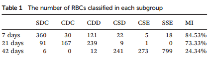 6.不同储存时间的全血样本中红细胞形态分布存在显著差异(图6)。7天储存组以正常双凹圆盘状红细胞(SDC,红框)为主;储存至21天后,部分细胞转变为皱缩盘状(CDC,绿框)和皱缩圆盘状(CDD,蓝框);而至42天时,细胞进一步细胞进一步转变为皱缩球形(CSD)、皱缩球状(CSE) 和 光滑球状(SSE)。模型在不同光照与背景条件下均能准确识别各亚群细胞,显示出良好的适应性与稳定性。根据红细胞形态指数(MI)计算,7天、21天及42天样本的MI分别为84.53%、73.33%和24.34%,提示血液质量随储存时间延长而逐渐下降。