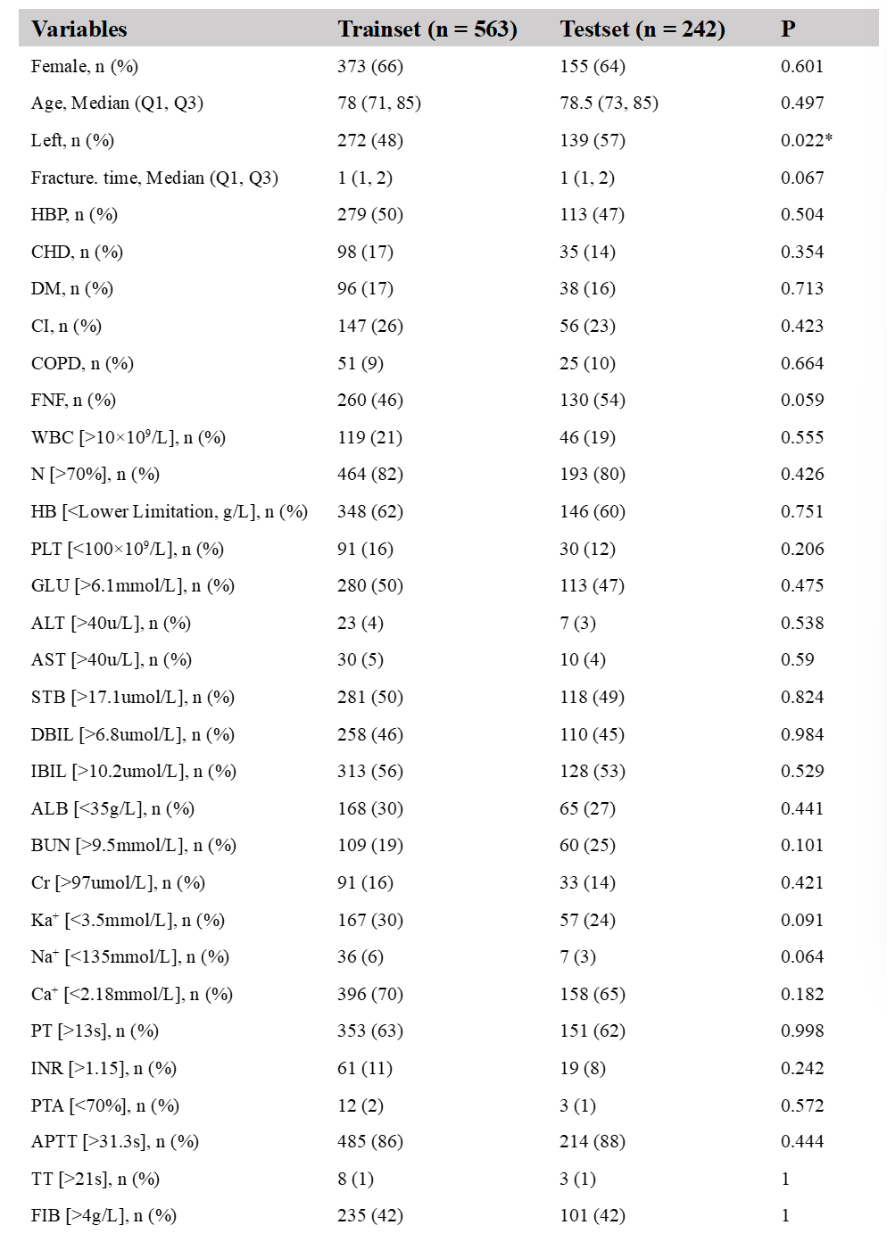 1.本研究最终纳入2016年5月至2022年11月某大学附属医院805例髋部骨折患者,其中306例(38.01%)在围手术期接受输血。所有患者按7:3比例随机分为训练集(563例)和验证集(242例),两组基线信息无显著差异(表1)。