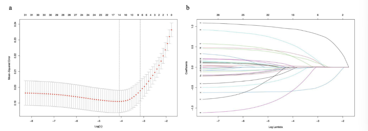 图2 采用LASSO回归分析筛选出可能的危险因素