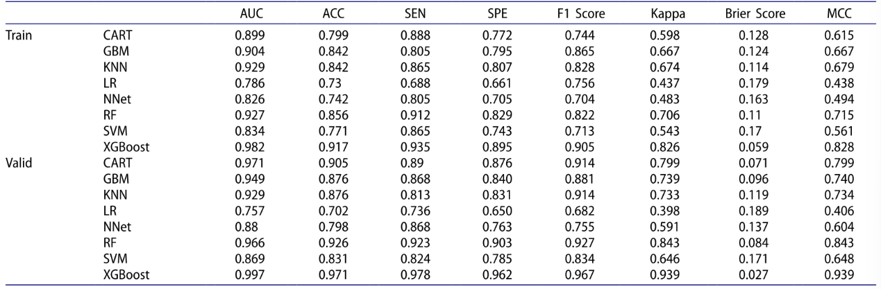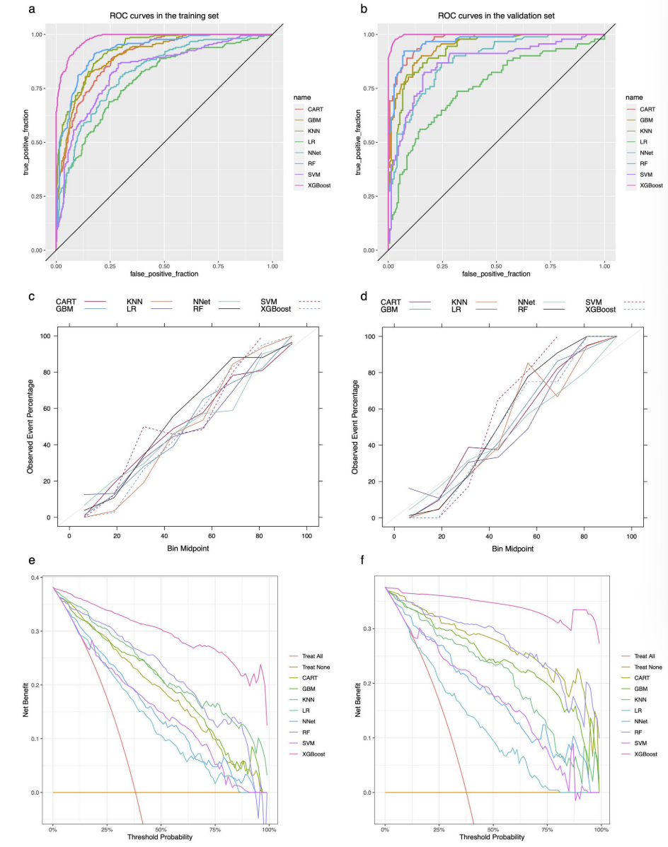 3. 采用分类回归树(CART)、梯度提升机(GBM)、k近邻(KNN)、逻辑回归(LR)、神经网络(NNet)、随机森林(RF)、支持向量机(SVM)、极端梯度提升(XGBoost)8种机器学习算法构建预测模型,通过10次10折交叉验证重采样评估性能,各算法所构建的评估结果如表3。其中马修斯相关系数(MCC):训练集中XGBoost算法MCC为0.828,验证集达0.939,显著高于其他算法(训练集其他算法MCC 0.438-0.715,验证集0.406-0.843),且MCC值均>0.7,表明预测性能良好(表3);ROC曲线下面积(AUC):XGBoost算法在训练集AUC为0.982(95%置信区间:0.974-0.989),验证集达0.997(95% 置信区间:0.955-1),在所有算法中最优(表3,图3a、3b);其他指标:XGBoost算法在准确率(ACC)、灵敏度(SEN)、特异度(SPE)、F1分数上均表现最优,训练集与验证集Kappa值分别为0.826、0.939,一致性极佳;布里尔分数分别为0.059、0.027,均接近0,总体性能优异;决策曲线分析(DCA)显示,其在宽阈值范围内净收益高于“全干预”或“无干预”策略(表3,图3c-f)。
