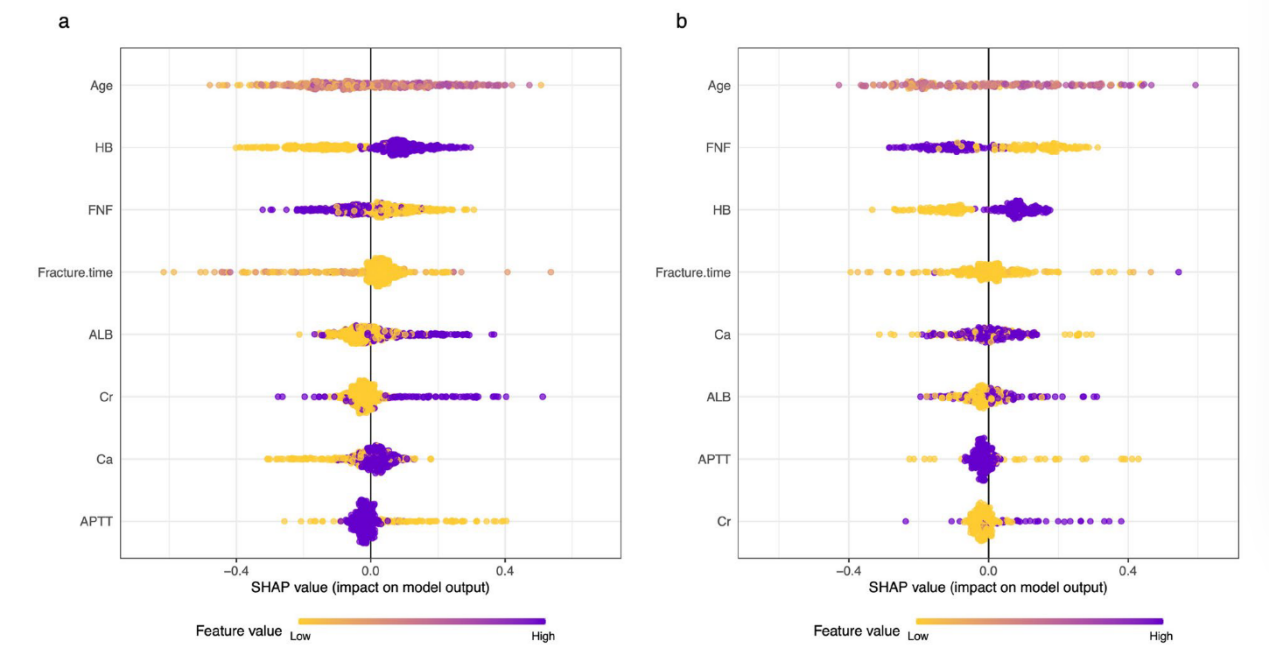 4.特征重要性:通过SHAP值分析发现,年龄、血红蛋白(HB)、股骨颈骨折(FNF)是老年人髋部骨折围手术期输血的前三大重要特征(图4)。