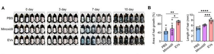 图3 红细胞外囊泡促进野生型小鼠毛发再生,并改善贫血小鼠的毛发和皮肤缺陷。