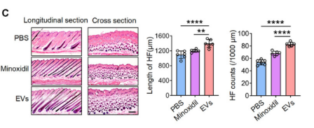 本研究首次揭示了红细胞与表皮系统的整合关系,红细胞外囊泡作为红细胞的代谢产物,可通过血液循环融入皮肤和毛发,既为其提供结构所需的血红蛋白、角蛋白、脂质等关键物质,维持皮肤屏障稳态,又能通过调控Wnt/β-catenin信号通路促进毛发再生。临床研究结果表明自体红细胞外囊泡是治疗雄激素性脱发的有效手段,为毛发再生相关疾病提供了安全、便捷的新治疗策略。