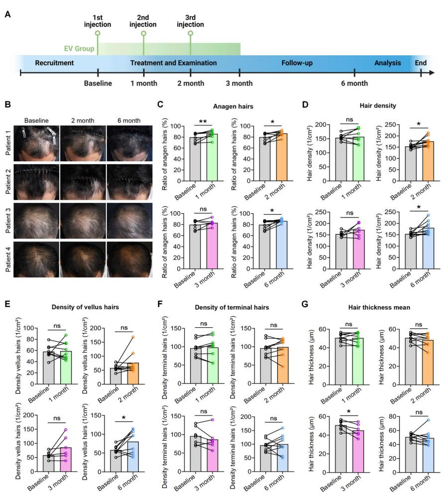 6. 临床应用效果:对9名雄激素性脱发(AGA)患者进行3次自体红细胞外囊泡局部注射治疗及6个月随访,结果显示患者生长期头发比例、头发密度和毳毛密度均显著提高,证实自体红细胞外囊泡可有效改善AGA患者毛发生长状况(图5)。