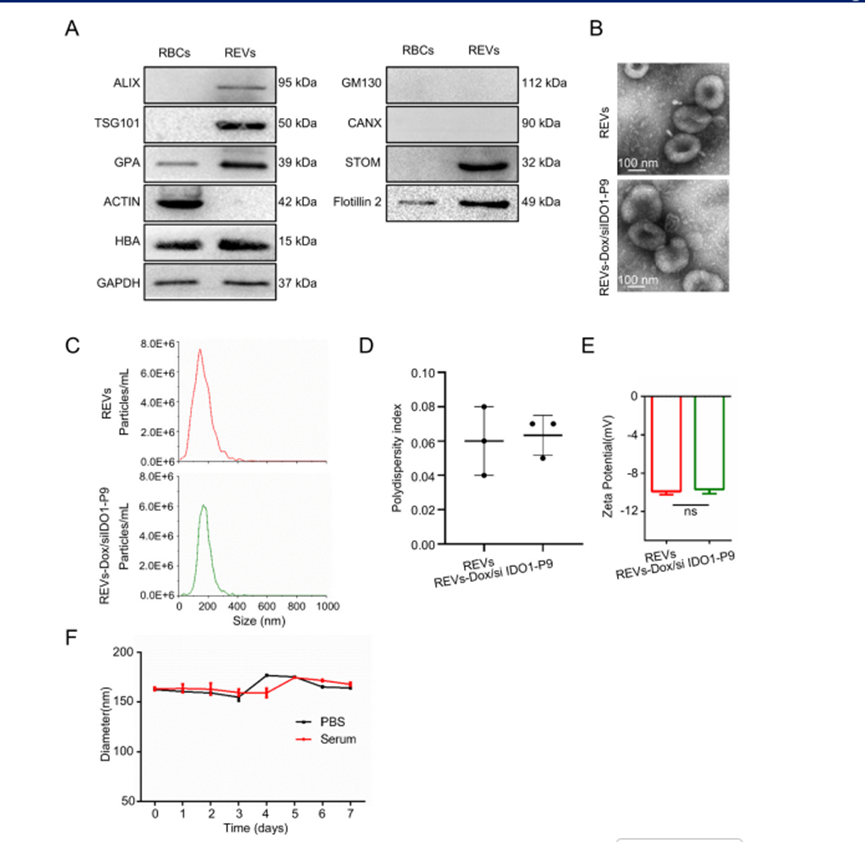 1.构建的 REVs-Dox/siIDO1-P9 在经多项表征后显示出良好的理化稳定性。REVs具有留典型胞外囊泡标志蛋白(ALIX、TSG101)、红细胞脂筏膜蛋白(Flotillin-2、STOM)及红细胞特异性蛋白(HBA),同时继续表达红细胞来源 EV 的特征性标志 GPA,而不含内质网及高尔基体相关蛋白(CANX、GM130)。β-actin 几乎不可检测,提示纯化过程有效去除了细胞碎片(图1A)。TEM 与 NTA 显示 REVs 维持杯状囊泡形态,虽在装载 Dox 和 siIDO1 后粒径由约 157 nm 略增至约 171 nm,但整体结构完整、形态一致;Zeta 电位也由 ?9.89 mV 保持在 ?9.69 mV,表明表面电性未发生实质改变(图1B–E)。进一步的血清稳定性实验显示,REVs-Dox/siIDO1-P9 在 PBS 或血清中孵育 7 天后粒径均未发生明显变化(图1F)。因此,最终选用的 REVs-Dox/siIDO1-P9 兼具结构稳定性与良好生理环境耐受性,可满足后续在体药物递送与功能研究的需求。