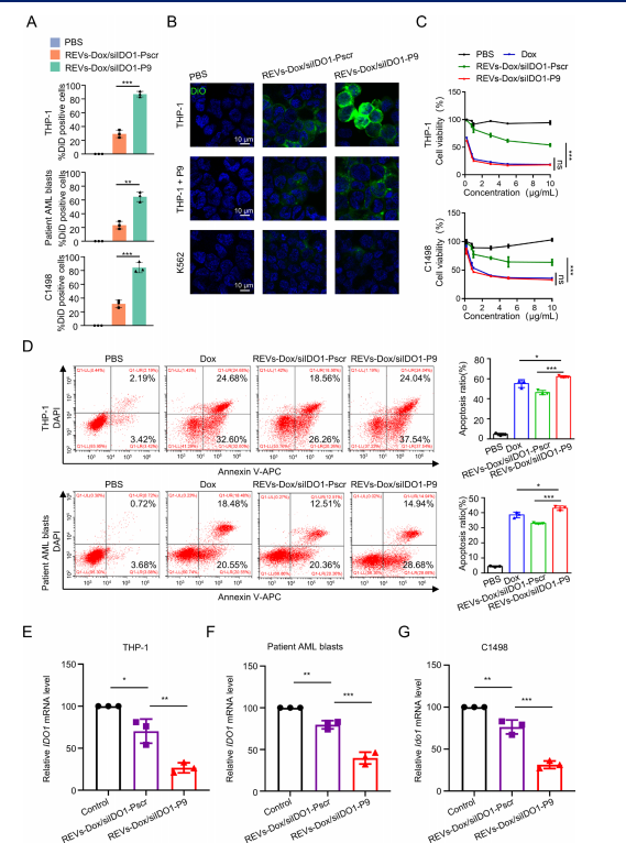 2.P9 修饰显著(REVs-Dox/siIDO1-P9)提升了REVs在体外对白血病细胞的靶向摄取与治疗效应。结果显示,与乱序肽Pscr修饰的囊泡相比,REVs-Dox/siIDO1-P9在THP-1、C1498细胞及AML原代白血病细胞中均表现出更高的内吞效率(图2A)。进一步的CLSM成像证实,P9可增强DiO标记的REVs在CLL-1阳性AML细胞中的摄取,而对CLL-1阴性的K562细胞无明显作用;游离P9的预处理可削弱该靶向效果,提示摄取依赖P9–CLL-1结合(图2B)。在相同剂量条件下,REVs-Dox/siIDO1-P9对白血病细胞的细胞毒性与游离Dox相当,而REVs-Dox/siIDO1-Pscr的杀伤能力明显较弱,说明靶向性是细胞毒性提升的关键因素(图2C)。同时,REVs-Dox/siIDO1-P9诱导的细胞凋亡率显著高于Pscr对照组(图2D)。两种囊泡均可下调白血病细胞中的IDO1,但P9修饰囊泡的抑制效果更为明显(图2E–G)。因此,P9的表面修饰不仅提高了囊泡的摄取效率,还增强了其促凋亡作用和对 IDO1 的抑制能力,为后续抗白血病治疗奠定了更优的体外效果。