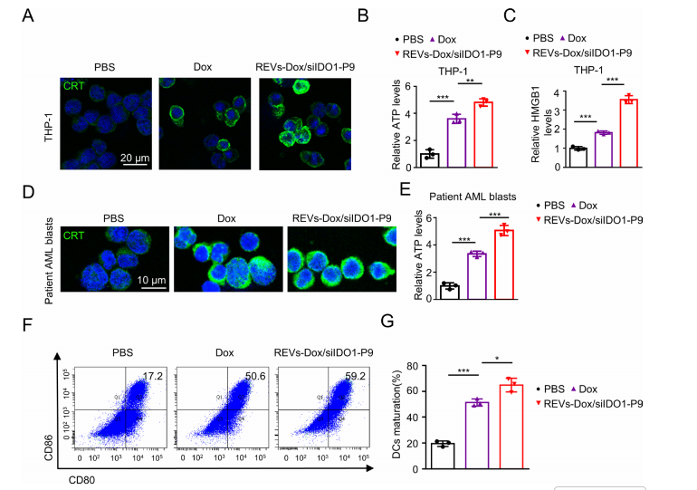 4.REVs-Dox/siIDO1-P9 能够有效诱导白血病细胞发生免疫原性细胞死亡(ICD)。在处理THP-1细胞后,可观察到显著增强的细胞表面CRT暴露(图4A),并伴随胞外ATP与HMGB1释放的大幅增加(图4B、C)。与游离Dox相比,REVs-Dox/siIDO1-P9诱导的CRT、ATP和HMGB1 水平均更高,表明其更强的ICD诱导能力可能源于更高的细胞内递药效率。类似结果同样出现在患者来源的AML原代白血病细胞中,其中CRT暴露及 ATP、HMGB1释放均显著升高(图4D、E)。进一步功能验证显示,REVs-Dox/siIDO1-P9处理后的AML原代细胞显著提高了成熟DC的比例(59.2% vs. 50.6%,图4F、G)。因此,REVs-Dox/siIDO1-P9 通过诱导 ICD 不仅增强了白血病细胞的免疫原性,也为后续免疫应答的激活奠定了关键基础。