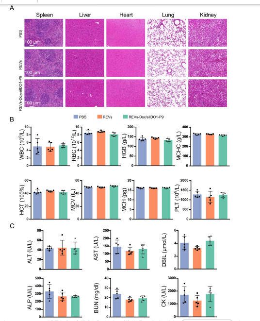 7. REVs-Dox/siIDO1-P9 在 AML 治疗中表现出良好的生物安全性。对主要脏器(脾脏、肝脏、心脏、肺和肾脏)进行 H&E 染色显示,各处理组均未观察到明显的炎症反应或组织损伤(图7A)。同时,血液学及血液生化指标均保持在正常范围内,未出现明显异常(图7B、C)。这些结果表明,REVs-Dox/siIDO1-P9 不仅具有优异的抗白血病疗效,还具备良好的体内安全性,为其在 AML 治疗中的潜在应用提供了坚实依据。