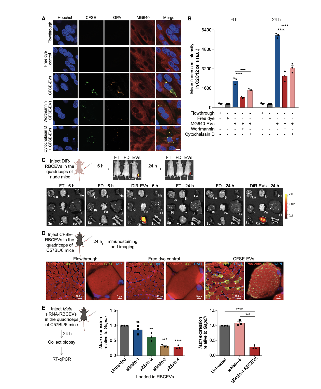 肌内注射后,RBCEVs 可通过内吞作用被肌纤维高效摄取,且极少渗漏至血液循环及其他器官,实现肌肉特异性递送;RBCEVs 能有效装载 Mstn siRNA 和 Mlycd siRNA(装载效率分别达 80.8% 和 81.7%),并保护 siRNA 免受核酸酶降解。体外及裸鼠体内实验证实 RBCEVs 通过内吞作用被肌细胞摄取,且荧光信号仅局限于注射部位肌肉(图1A-C);C57BL/6 小鼠肌内注射后,CFSE 标记的 RBCEVs 被多个肌纤维内化,siMstn-4-RBCEVs 可显著抑制 Mstn 表达(图1D-E)。