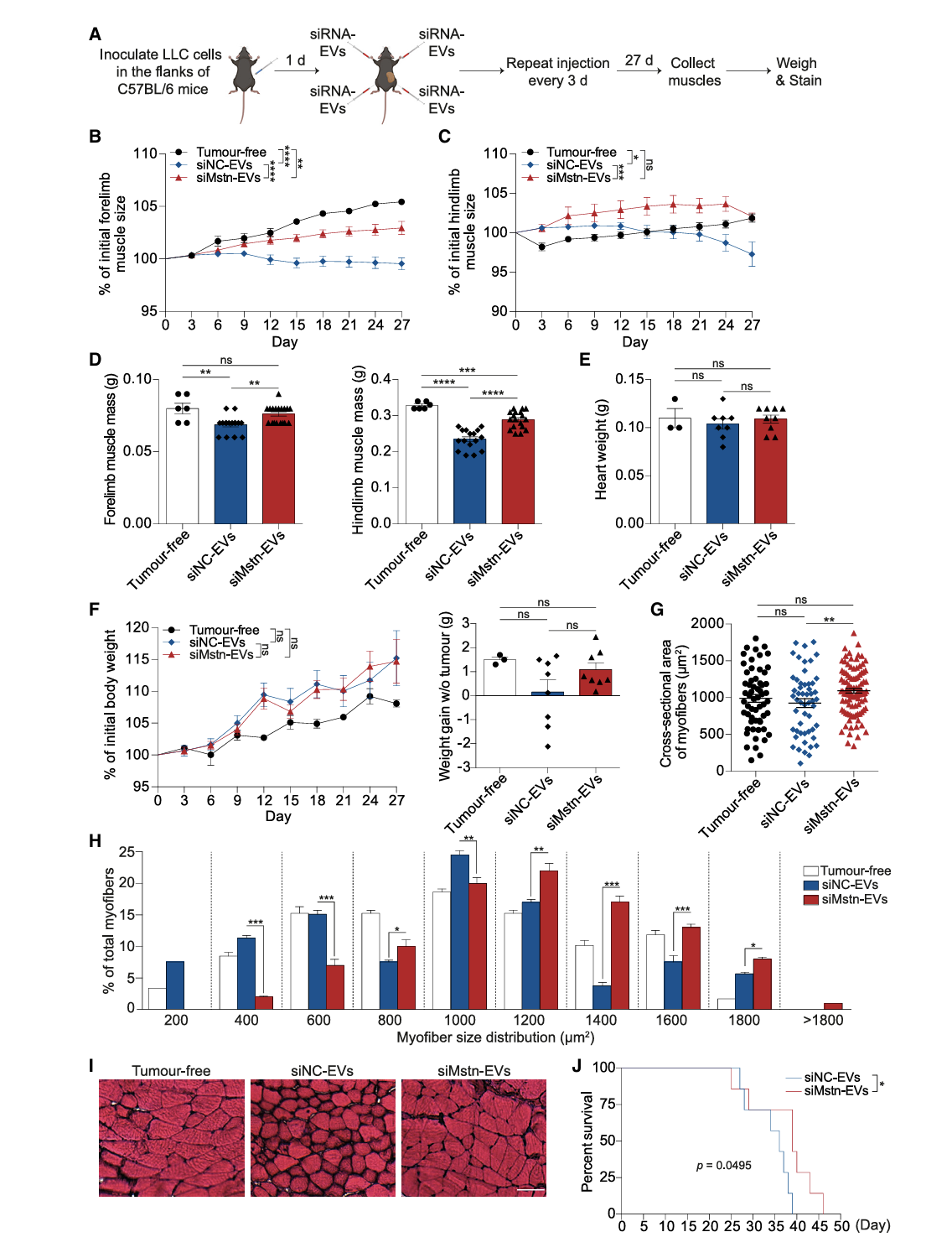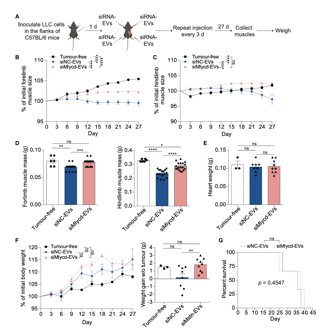 Mstn siRNA的治疗作用:装载 Mstn siRNA 的 RBCEVs 肌内注射可显著抑制小鼠骨骼肌 Mstn 表达,促进肌肉生长,使肌肉重量增加 24.2%(图2B-D);通过 qPCR 和 Western blot 证实 Mstn mRNA 及蛋白表达被有效抑制(图2G-H)。在肺癌恶病质小鼠模型中(图3A),siMstn-EVs 可维持前肢、后肢肌肉大小(图3B-C);研究证实肌肉质量、肌纤维横截面积增加,且显著延长小鼠生存期(图3D-G)。