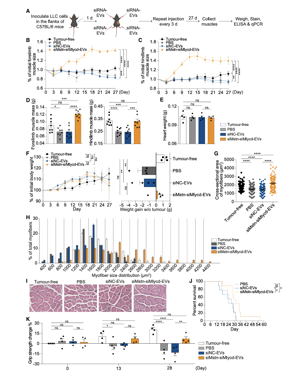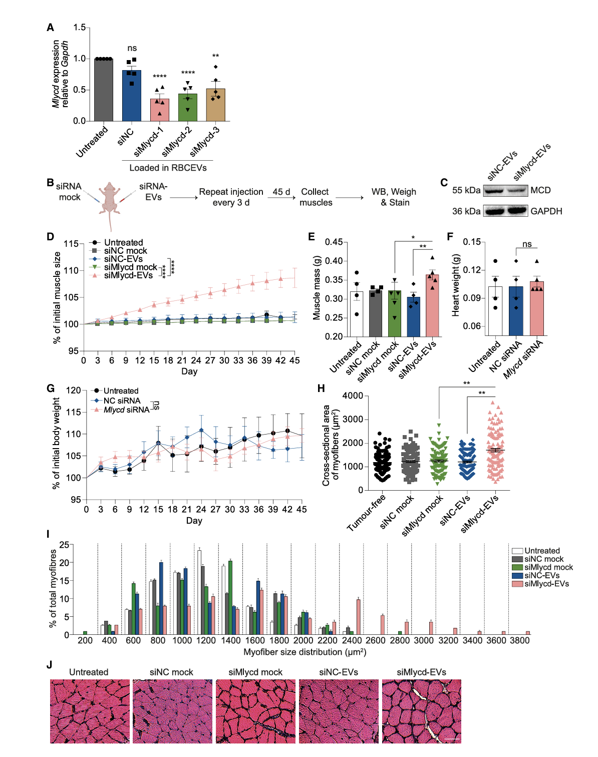 Mlycd siRNA 的治疗作用:装载 Mlycd siRNA 的 RBCEVs 同样能促进肌肉生长,改善恶病质小鼠的肌肉消耗,增加去瘤后的体成分重量。研究筛选出抑制效果最佳的 siMlycd-1(图4A);图4B为实验设计;研究证实 Mlycd 蛋白表达被抑制,肌肉重量、大小显著增加(图4C-E);实验显示肌纤维横截面积显著扩大,且大尺寸肌纤维(2400-3800μm2)的比例明显升高(图 4H-J)。图5A为治疗方案;研究显示 siMlycd-EVs 可维持恶病质小鼠前肢、后肢肌肉量(图5B-D);证实体成分重量增加,且无明显心脏毒性(图5E-F)。