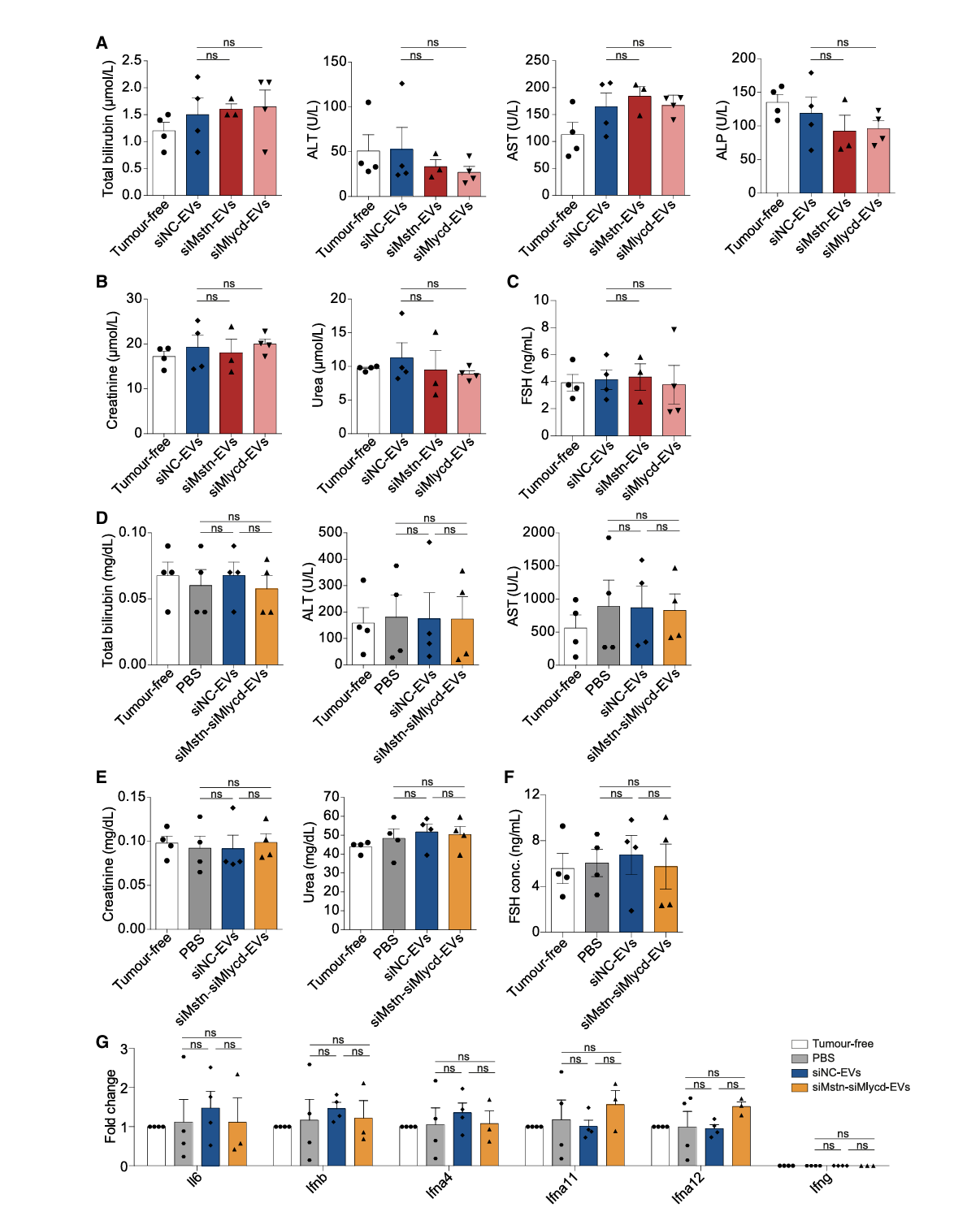 治疗剂量下,RBCEVs 递送系统未引起肝肾功能损伤,血清肝肾功能相关指标(ALT、AST、肌酐等)均无异常(图 7A-B、7D-E);也未引发全身炎症反应(图 7G),且血清促卵泡激素(FSH)水平与对照组无差异,避免了传统 Mstn 抑制剂的脱靶效应(图 7C、F)。